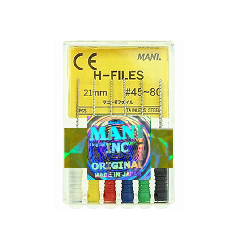 Mani H-Files 21mm MANI H-FILES STAINLESS STEEL 21mm are indispensable dental instruments meticulously designed for endodontic excellence. Crafted from high-quality stainless steel, these files combine durability and corrosion resistance to ensure reliable performance. With a length of 25mm, they are adept at reaching deep within root canals, facilitating thorough cleaning and precise shaping while minimizing the risk of damage to tooth structures. The defining feature of Mani H-Files is their extraordinarily sharp cutting edges, allowing for efficient removal of debris, infected tissue, and dentin. Their smooth, mirror-like finish enhances maneuverability and ease of use, ensuring a seamless procedure. These files play a pivotal role in preserving natural teeth, promoting oral health, and enhancing patient well-being. Their versatility and precision make them essential tools for endodontic professionals, adapting to the diverse anatomical variations in tooth roots. Mani H-Files 25mm are a testament to precision and quality, contributing to successful root canal treatments and overall dental care.