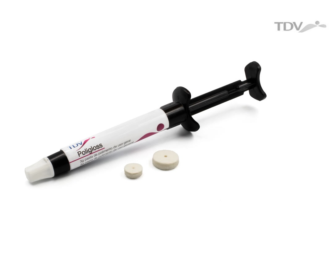Indicated for final polishing and maintenance of esthetic restorations, providing a final gloss in all restorative materials and dental enamel. Poligloss can also be combined with TDV felt discs or other velvety discs.