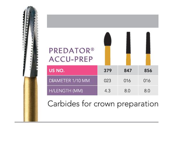 Accu prep carbides match the most popular diamond bur shapes used for crown preparations. Their aggressive carbides cutting blades remove enamel efficiently with minimum friction and heat build up. Unique blade angulations and teeth geometry engineered for highly efficient cutting with minimum clogging. Blades at the tip designed for smooth exact margins with minimal gingival abrasion.