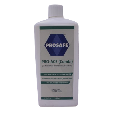 PRO-ACE (Combi) is uniquely formulated high level disinfection concentrate for surfaces and medical instruments having combination of glutaraldehyde and benzalkonium chloride to eradicate maximum number of pathogens. The solution also has excellent efficacy against Bacteria (incl. MRSA and TB), Fungi, Virus (Adeno, Rota, HBV, HIV, HCV, Polio, BVDV etc.) and SPORES.