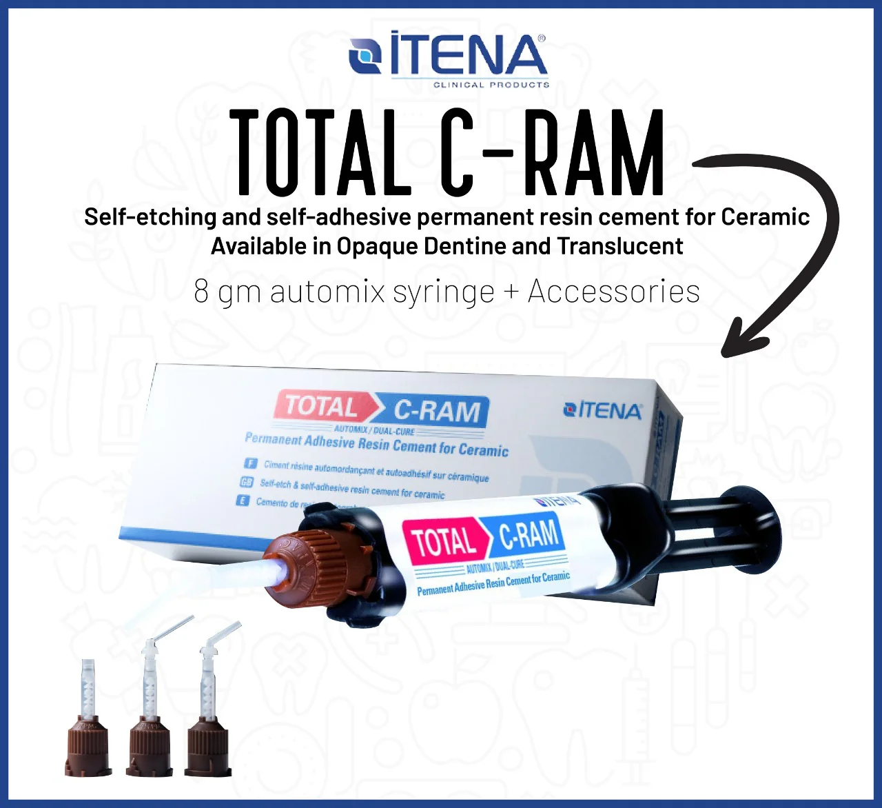 Total C-Ram is dedicated to permanent cementation of: crowns, bridges, inlays, onlays, veneers and posts.